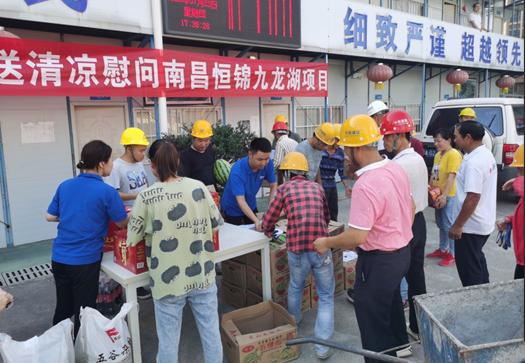 為關(guān)心員工身心健康,切實做好防暑降溫工作。7月23日,作為我司上級工會的湖南建工集團工會副主席黎勁,向奮戰(zhàn)在一線的南昌恒錦九龍湖項目部同事送去各類清涼物資,包括王老吉、西瓜、藿香正氣水、綠豆湯等防暑降溫品,把清涼送到施工一線,把關(guān)愛送到員工心間,給炎炎夏日仍然堅守崗位的建設(shè)者們送上了絲絲涼意和殷切關(guān)懷。