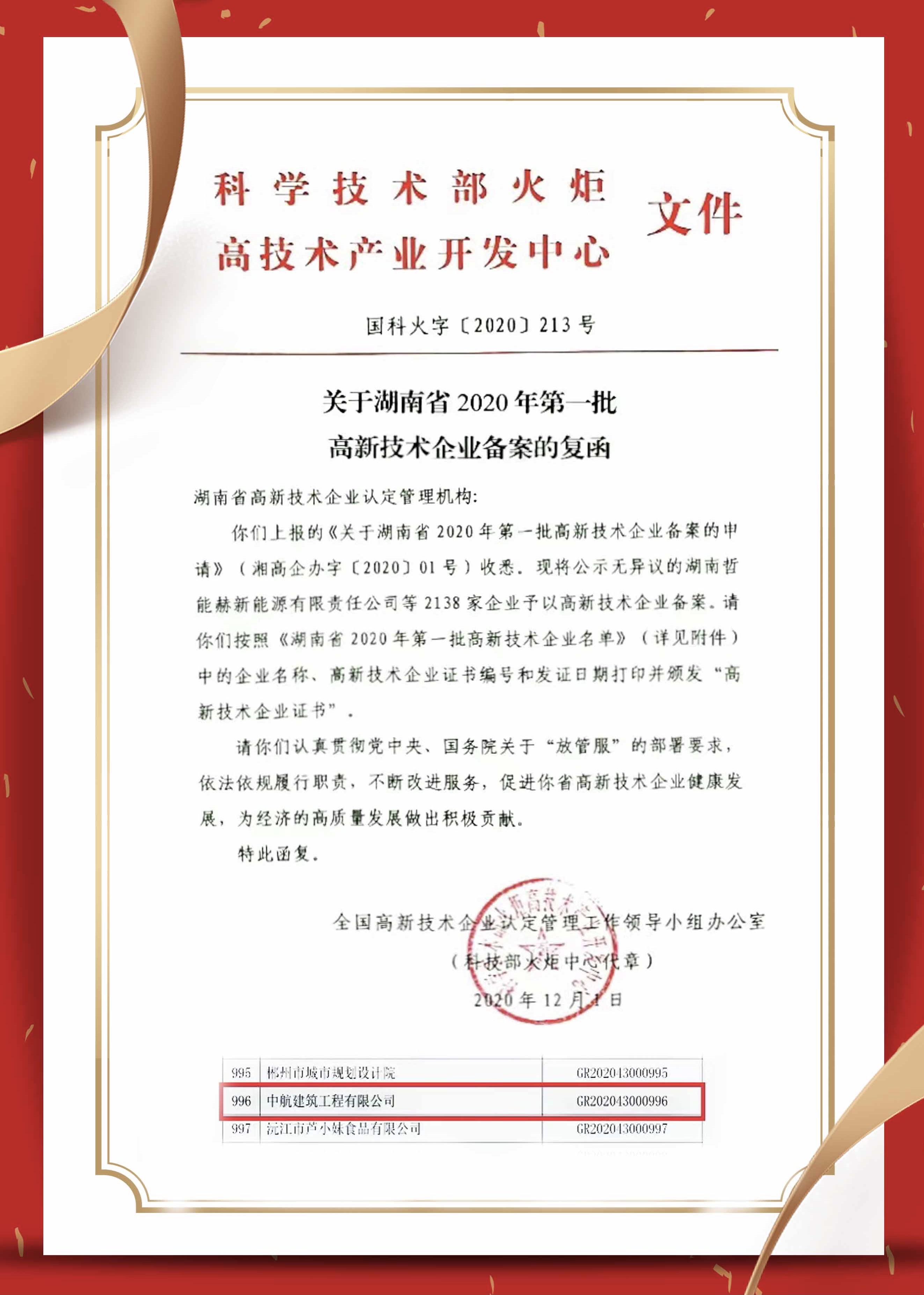 近日,公司順利通過(guò)了國(guó)家“高新技術(shù)企業(yè)”再次認(rèn)定,獲得由湖南省科學(xué)技術(shù)廳、湖南省財(cái)政廳、國(guó)家稅務(wù)總局、湖南省稅務(wù)局聯(lián)合頒發(fā)的高新技術(shù)企業(yè)證書。這是繼2017年首獲“高企”認(rèn)定三年期滿之后,公司再次獲得此項(xiàng)殊榮。